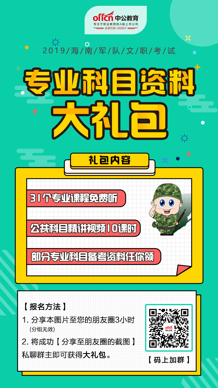 【导语】2019全国军队文职人员招录公告发布,中公海南军队文职考试网为大家整理了2019全国军队文职人员招录公告信息,欢迎加入海南军队文职交流群737149951,关注海南文职人员考试(hiwzryks)微信公众号,了解更多军队文职考试信息,我们还提供了军队文职考试相关的资料,预祝大家考试顺利。